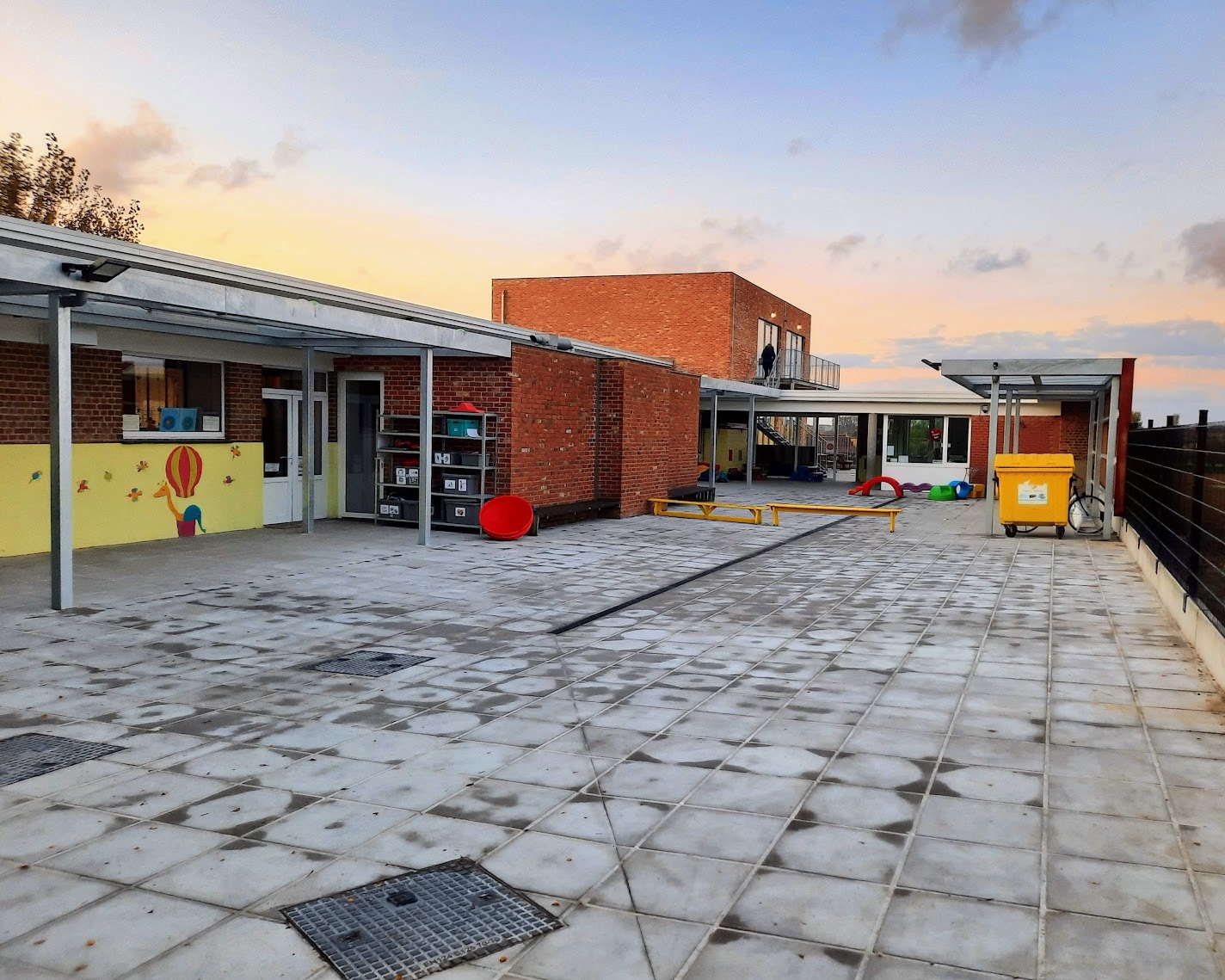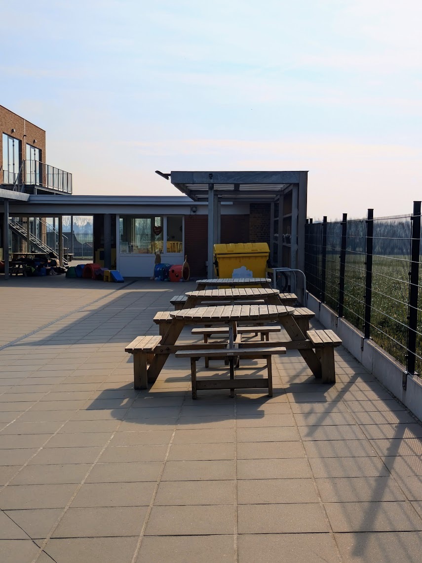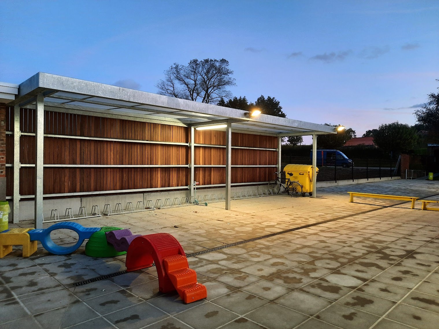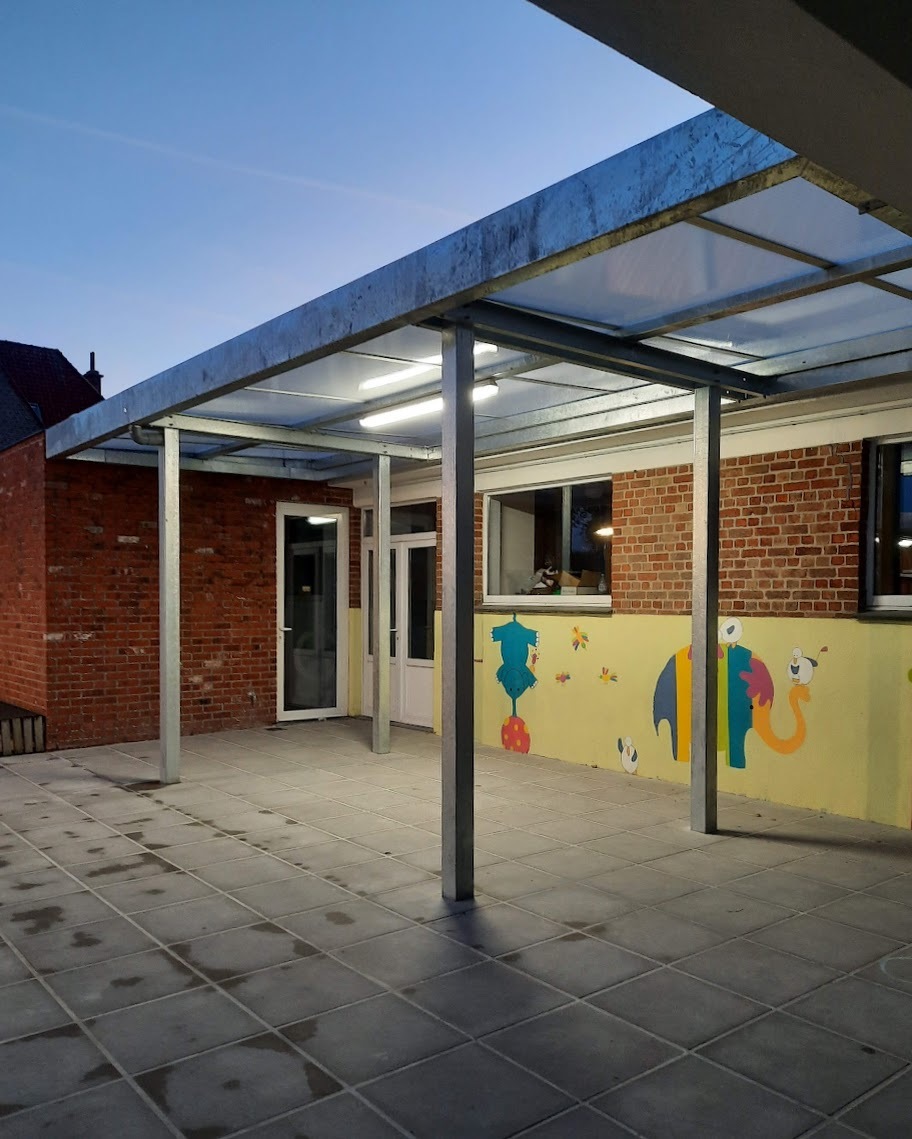 De speelplaats van vrije basisschool 'De Kleine Prins' in Abele was toe aan een grondige vernieuwing. In opdracht van de stad Poperinge nam ABS deze transformatie voor haar rekening. Na de afbraak van de verouderde overkappingen en de volledige uitgraving van de oude koer, maakten we de weg vrij voor een moderne heraanleg. De buitenruimte werd volledig genivelleerd en opnieuw ingericht met gloednieuwe overkappingen en een functionele fietsenstalling. Dankzij de nieuwe omheining geniet de school nu van een open uitzicht op de omliggende natuur, wat samen met de houten afwerking zorgt voor een harmonieus en esthetisch geheel.