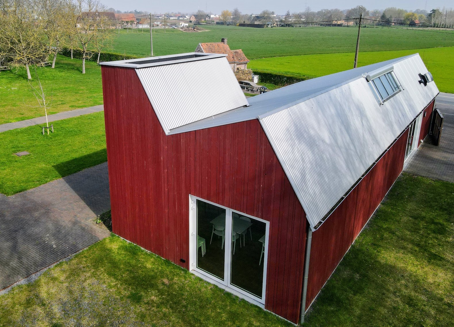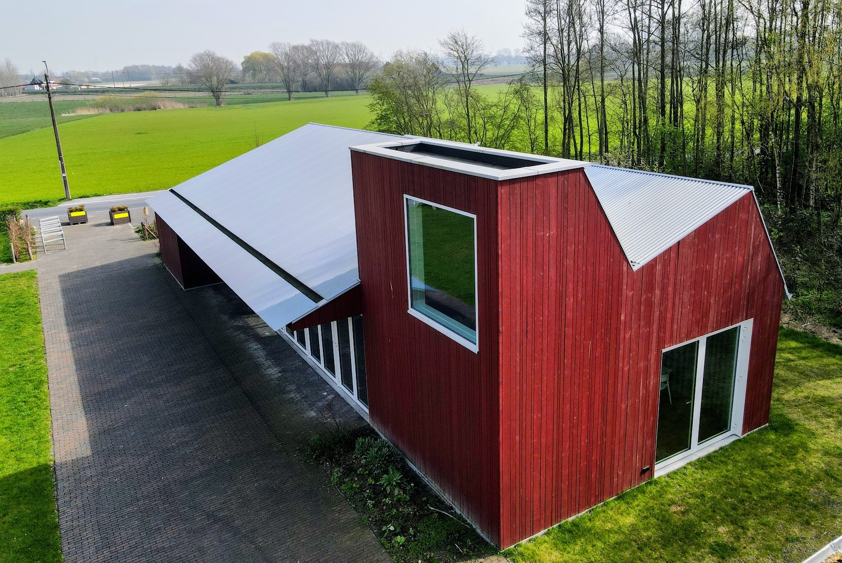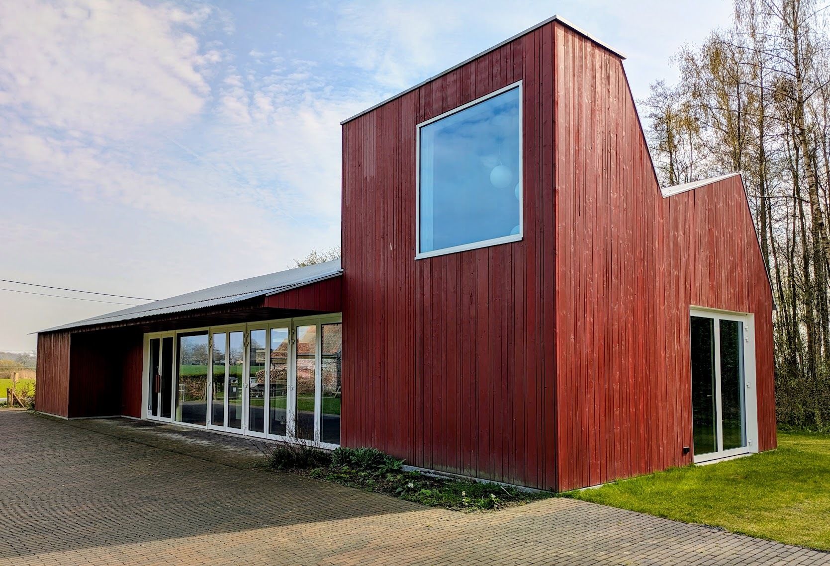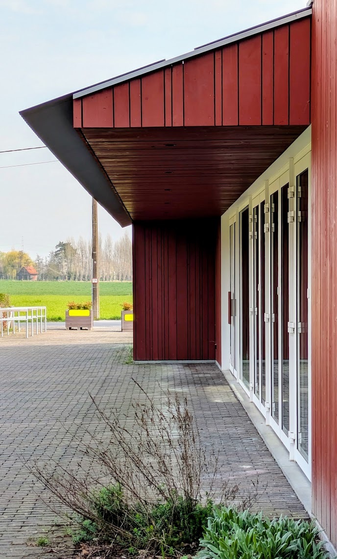 De afwerking van de gevel in rode houten latjes in verschillende maten geeft het gebouw nog extra karakter.
